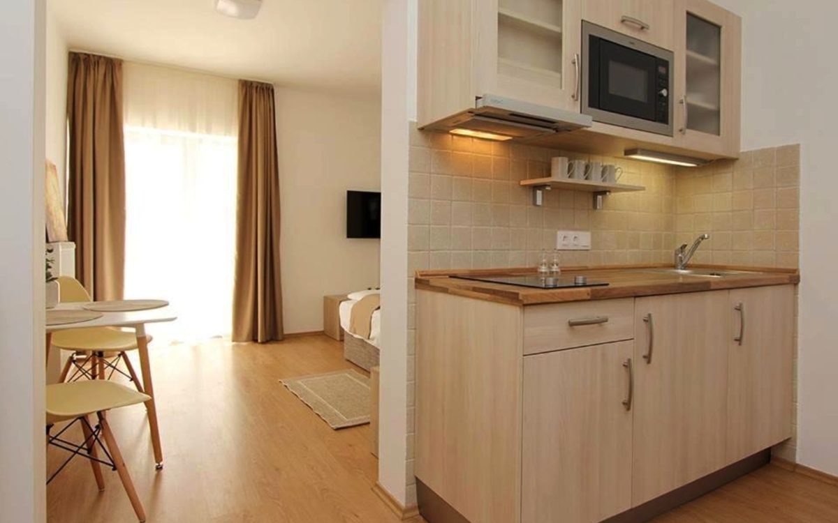 Die Appartements bieten eine gut ausgestattet Kochnische, sodass Sie sich gut selbst versorgen können. Das Frühstück können Sie im 4* Hotel Palace in Buffetform einnehmen. Wer in seinem Urlaub nicht selbst kochen möchte, kann eines der nahe gelegenen Restaurants in Bad Hévíz besuchen und ungarische sowie internationale Speisen genießen.