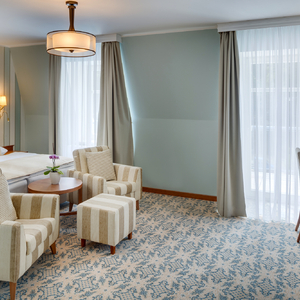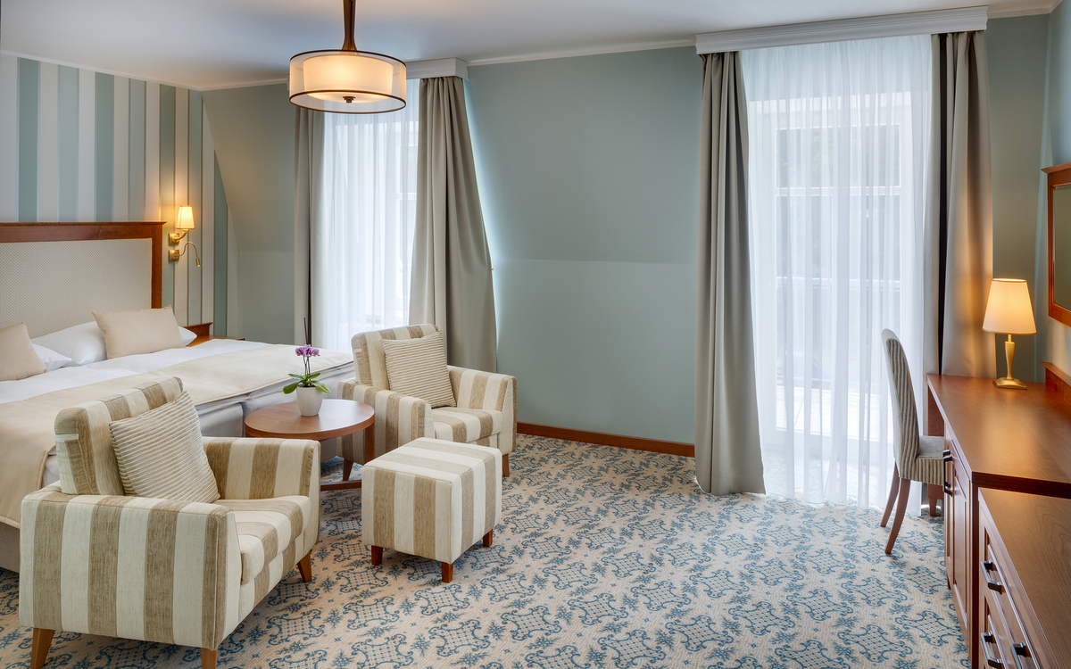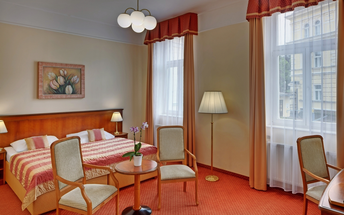 Alleinreisende erhalten im Maria Spa Ensana Health Spa Hotel großzügige und luxuriös ausgestattete Doppelzimmer zur Alleinbenutzung. Die Zimmer verfügen über eine hochwertige Einrichtung, einen Blick auf den Park oder die Kolonnade und teilweise über einen Balkon oder eine Terrasse.