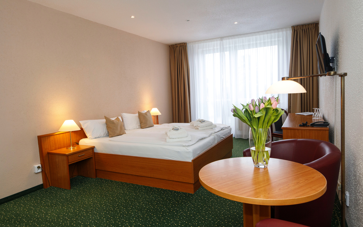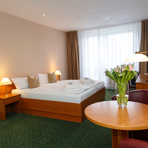 Die Doppelzimmer Komfort im Hotel Pyramida befinden sich entweder im Hauptgebäude und verfügen über keinen Balkon oder im Nebengebäude und sind mit einem Balkon ausgestattet. Einige der Zimmer können bei Bedarf mit einem Zustellbett ausgestattet werden. Behindertengerechte Zimmer in dieser Kategorie sind auf Anfrage möglich.