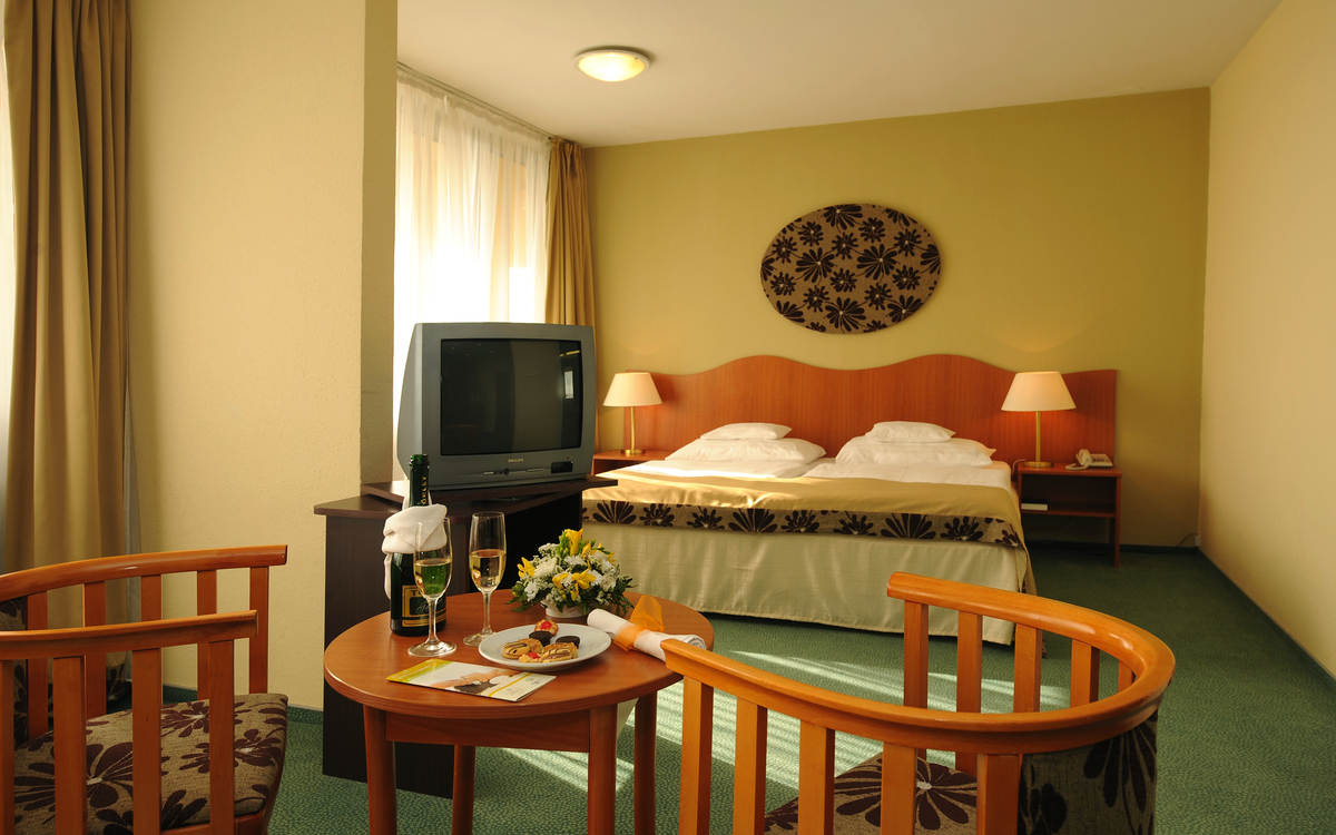 Das ruhig gelegene Hotel verfügt über Doppelzimmer, Familienzimmer und Suiten, die ausgestattet sind mit Dusche/WC, Fön, Leihbademantel, LED-TV, kostenfreiem Internetzugang (WLAN), Safe, Minibar, Balkon und einer regulierbaren Klimaanlage. Darüber hinaus verfügt das Hotel über ein eigenes Restaurant, eine Heilquelle mit rundum erneuertem Heilbad, Therapiebereich, Wellness-Centrum sowie einem Erlebnispool und eine Sonnenwiese im Freien. Des Weiteren finden Sie im Hotel eine 24-Stunden-Rezeption, Lifte, kostenfreien Internetzugang (WLAN) im ganzen Gebäude, eine Lobby-Bar und eine Terrasse.
