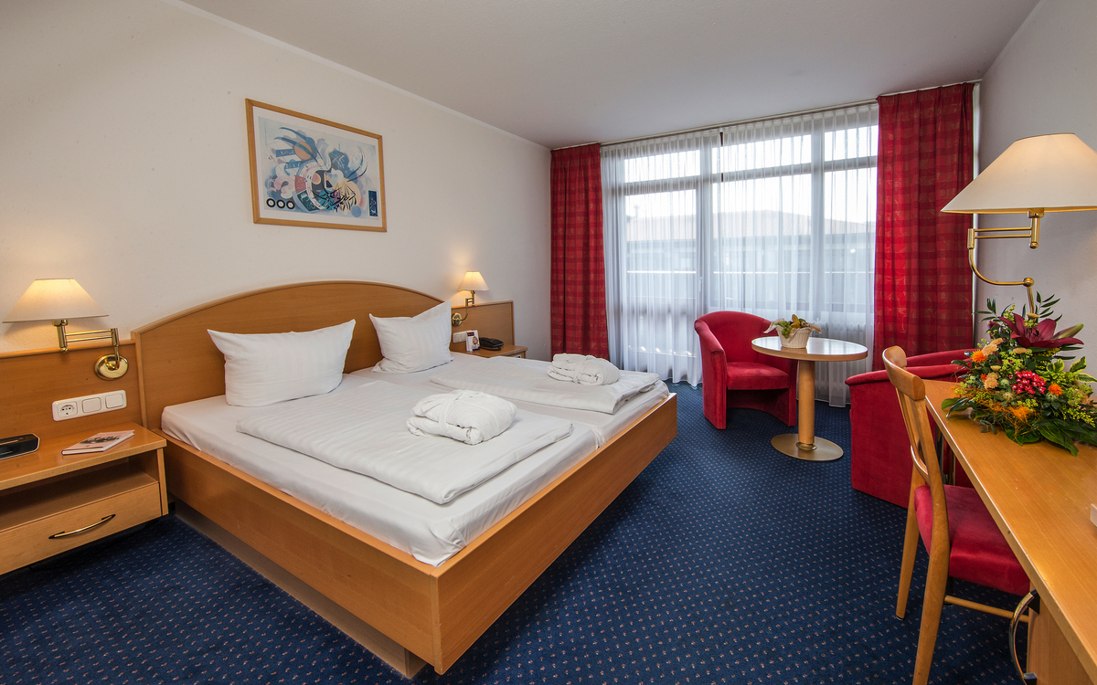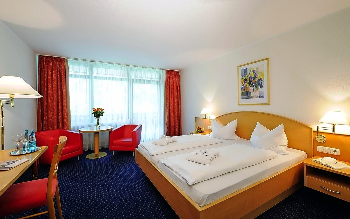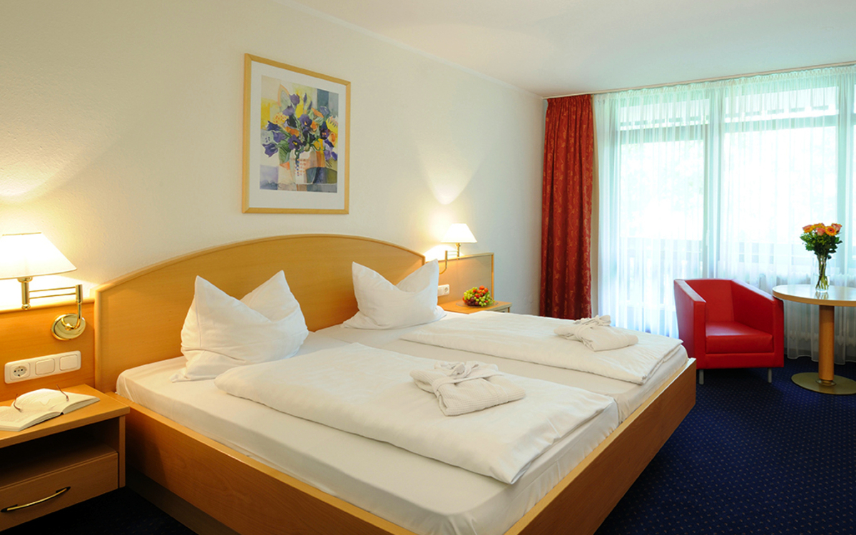 Die 184 Zimmer des Hauses sind mit Dusche/WC, Föhn, Leihbademantel, Sat.-TV, Radio, Telefon, kostenfreiem Internetzugang (WLAN), Kühlschrank, Wertfach und Balkon ausgestattet. Einzelzimmer sind Doppelzimmer zur Alleinbenutzung. Die Doppelzimmer mit Wiesenblick (gg. Aufpreis) verfügen zusätzlich über einen schönen Gartenblick.