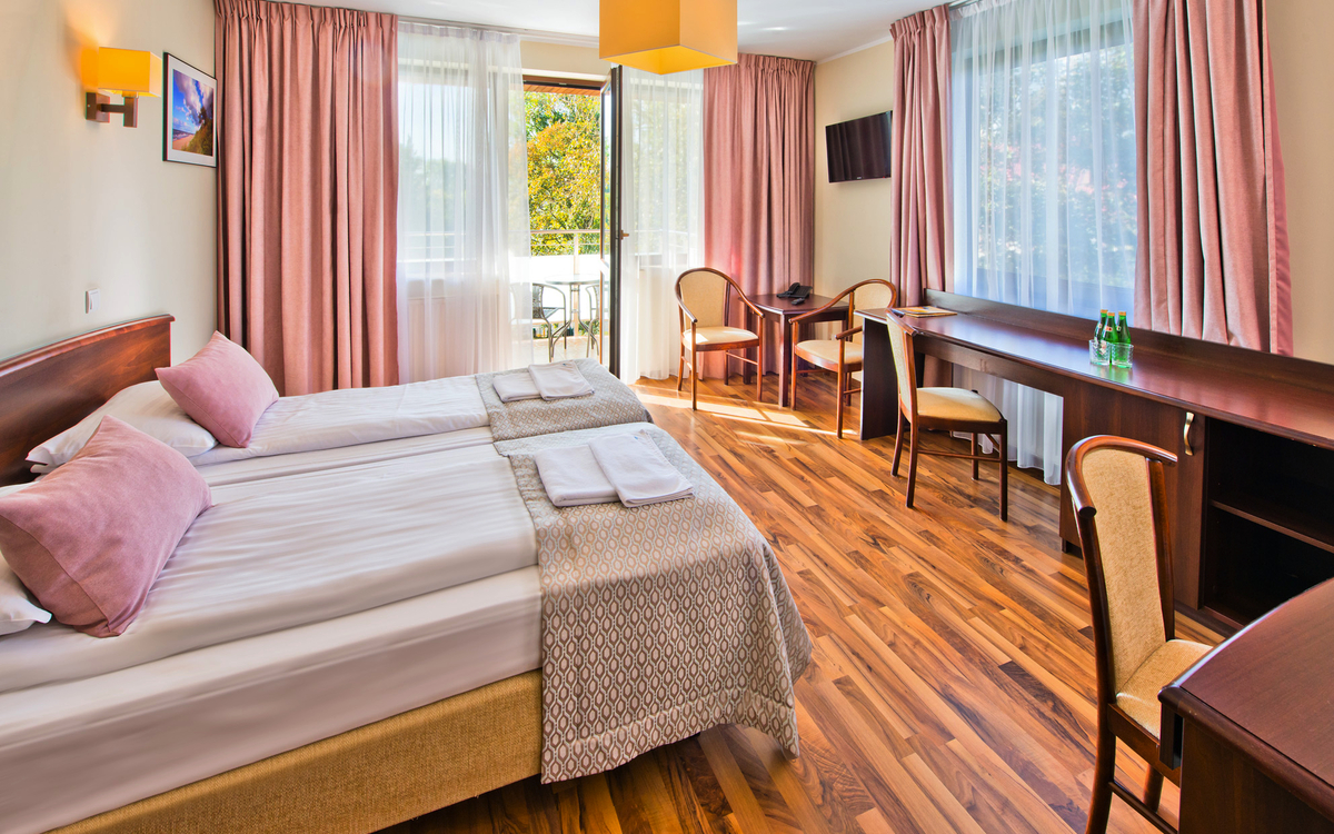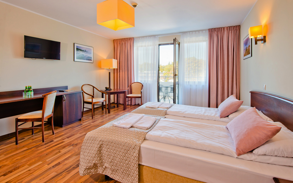 Die Doppelzimmer im Kurhaus Olymp 2 sind gemütlich eingerichtet und von Sonnennlicht durchflutet, perfekt für das Extra an Entspannung auf Ihrem Zimmer. Zum Teil verfügen die Zimmer über einen Balkon.