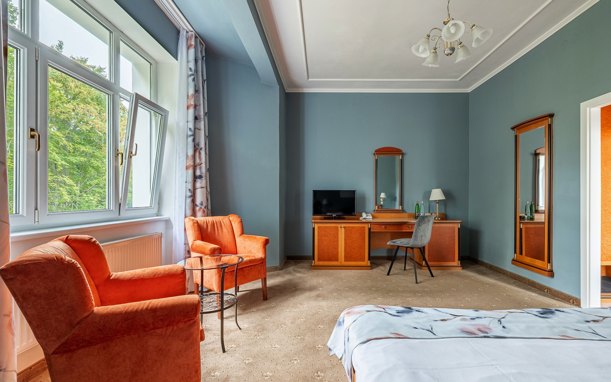 Die Suite mit Balkon ist noch etwas größer als die normale Suite und verfügt zusätzlich über einen Balkon mit wunderschönem Blick zum Waldpark.