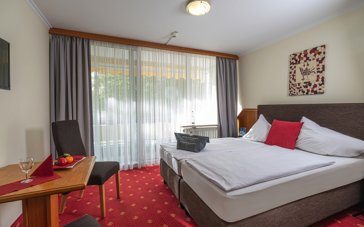 Die Doppelzimmer im Kurhotel Unter den Linden sind mit Queensize-Boxspringbett ausgestattet und sind in freundlich warmen Erdtönen gestaltet, die für ein pures Wohlfühl-Ambiente sorgen.