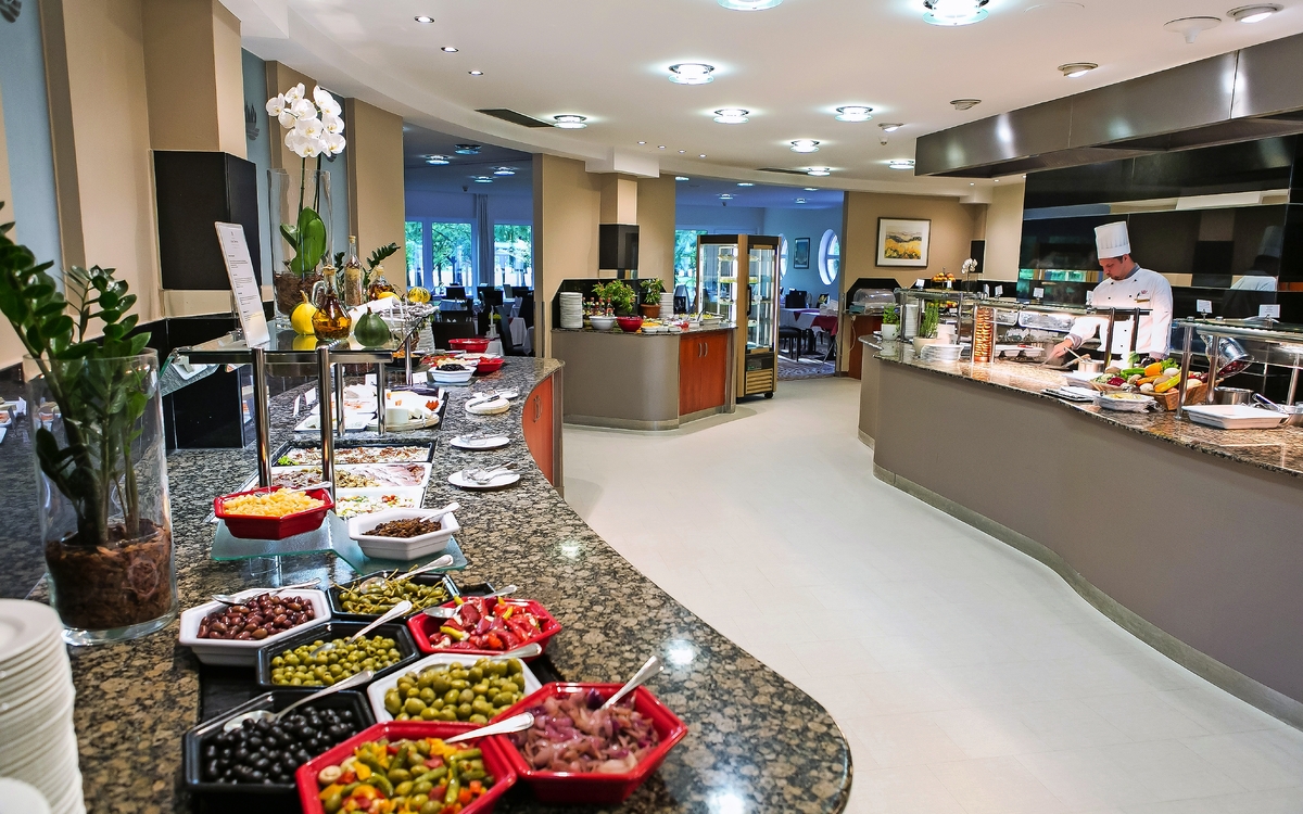 Große Vielfalt genießen Sie im Rahmen der Halbpension im Restaurant Corvinus mit reichhaltigem Frühstücks- und Abendbuffet sowie mit Spezialitäten der ungarischen, internationalen, vegetarischen und Bioküche. Die Shali Mar Bar mit Sonnenterrasse rundet das kulinarische Angebot ab.