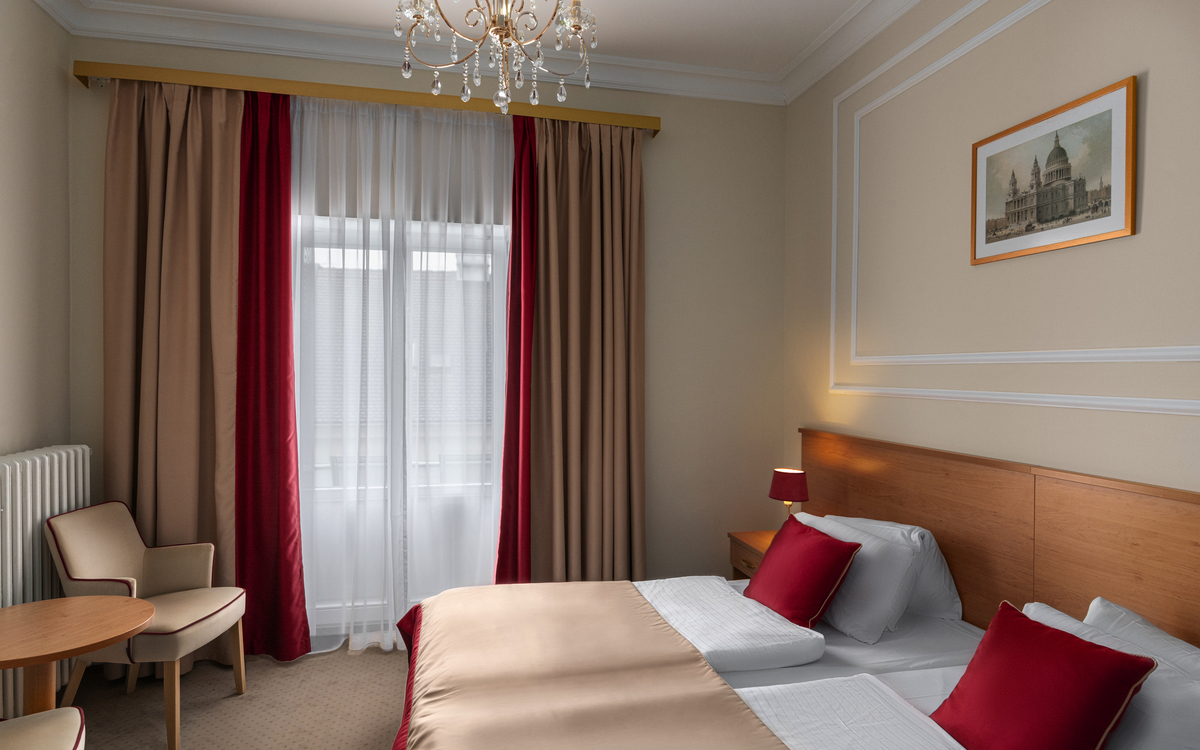 Die Doppelzimmer Standard im Savoy Spa & Medical Hotel sind gemütlich eingerichtet und verfügen über einen Blick auf den Innenhof oder die Straße.