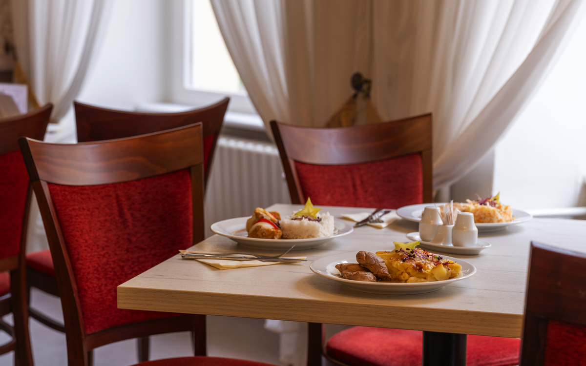 Den Morgen starten Sie mit einem reichhaltigen Frühstücksbuffet. Abends wählen Sie aus vier verschiedenen Speisen der traditionellen böhmischen Küche. Spezielle Ernährungsweisen wie Trenn- und vegetarische Kost werden auf Anfrage gerne berücksichtigt.